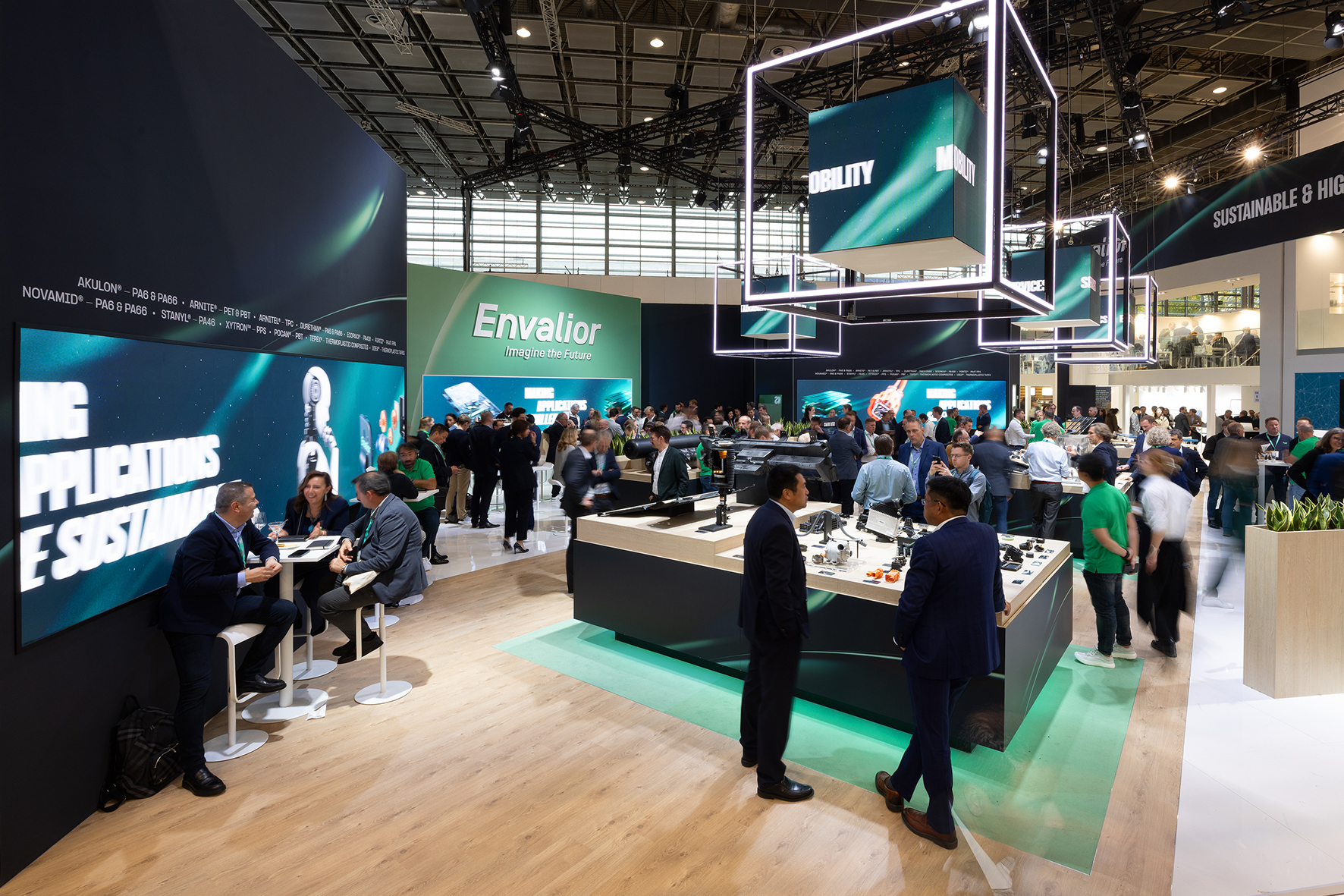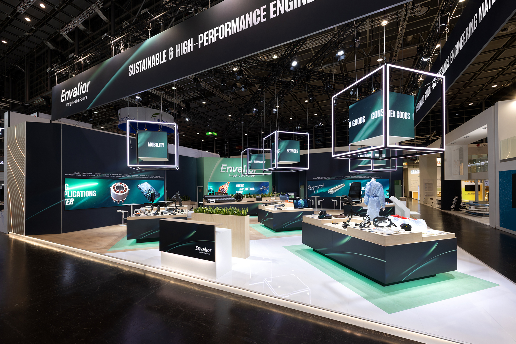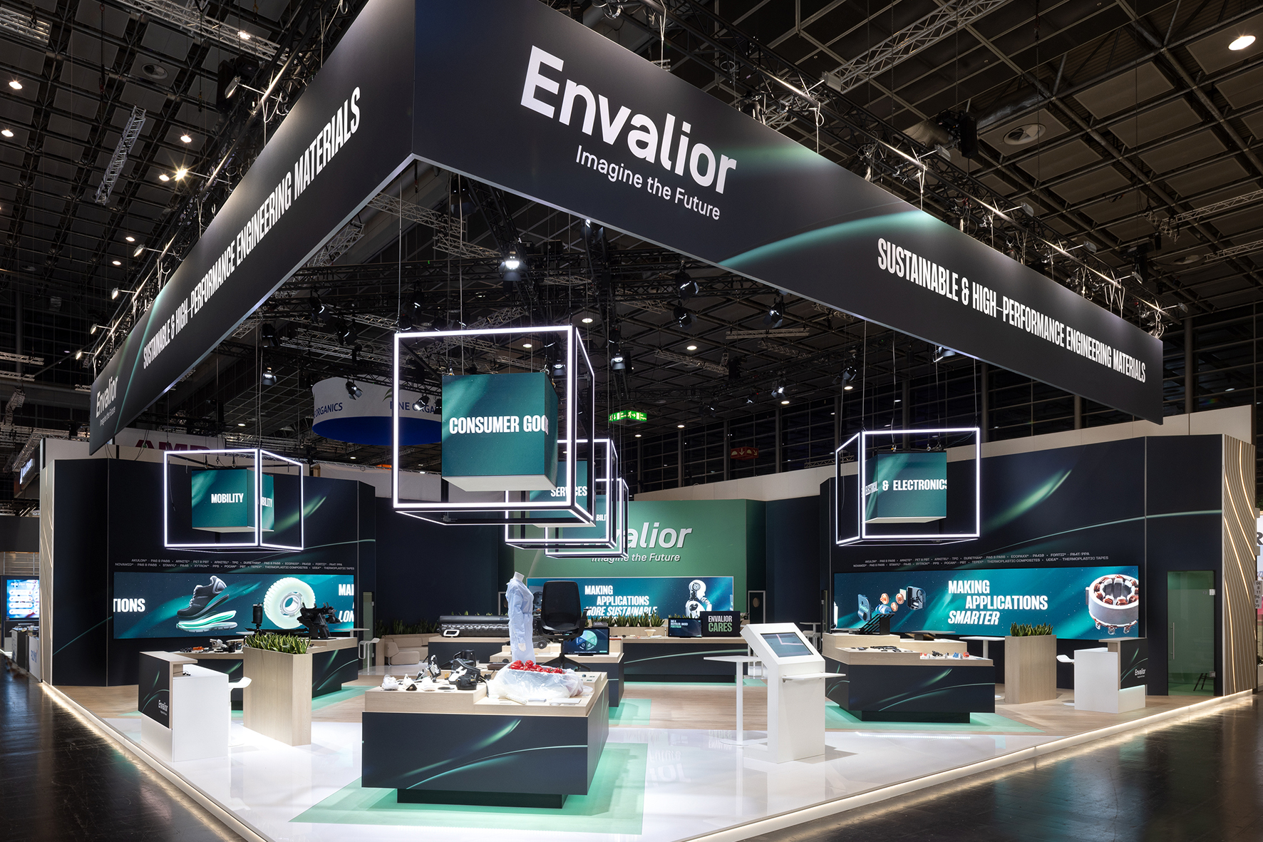 Een opvallende en levendige stand, boordevol innovaties, die de energie en merkidentiteit van Envalior perfect weerspiegelt. Grote LED-verlichte kubussen met geïntegreerde projecties en imposante LED-wanden lieten het diverse productaanbod van het bedrijf schitterend zien en maakten een onvergetelijke indruk.
