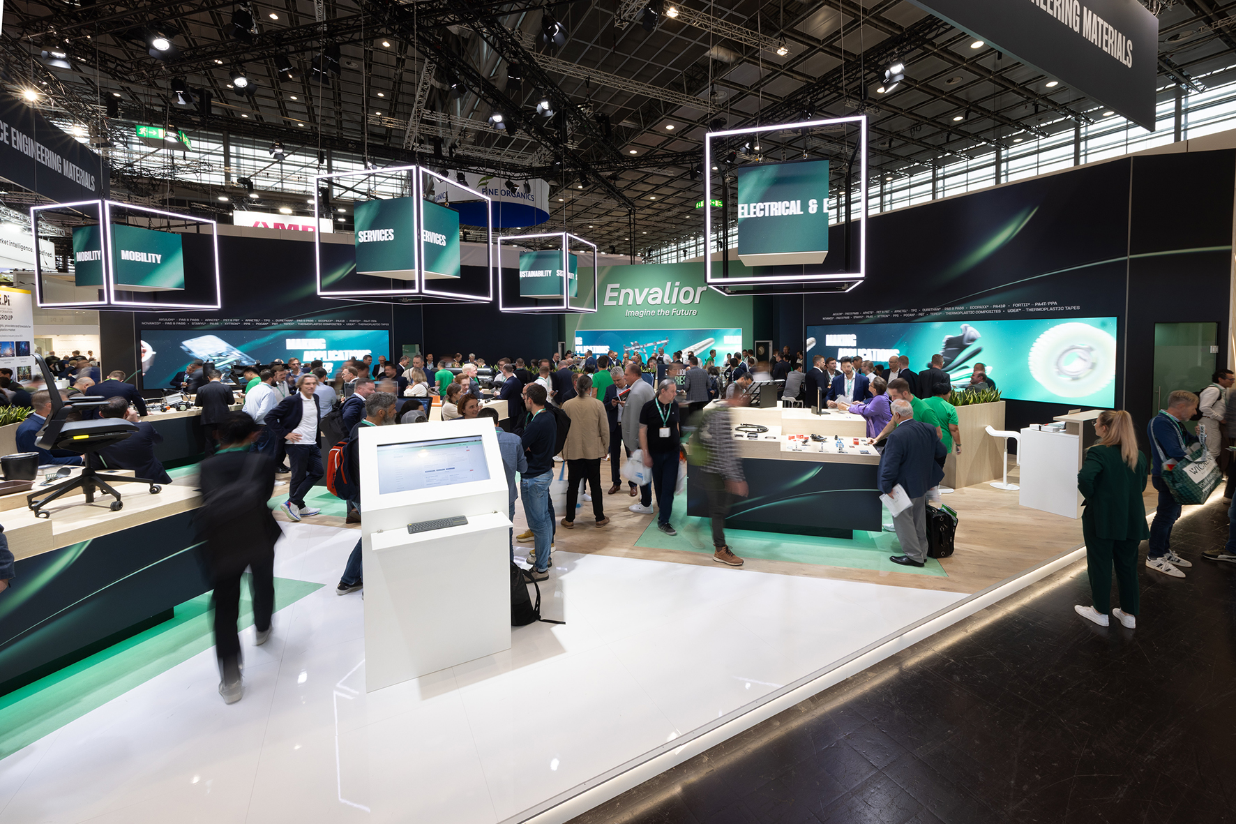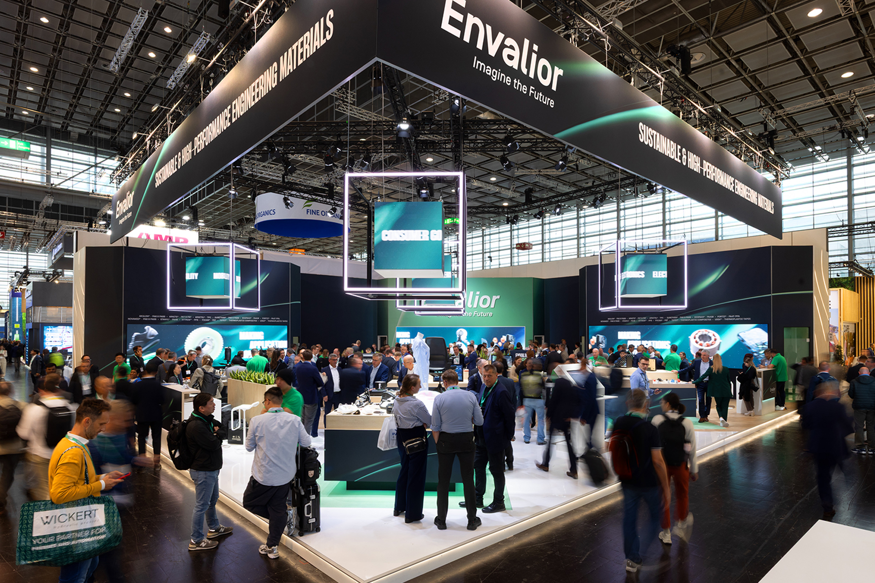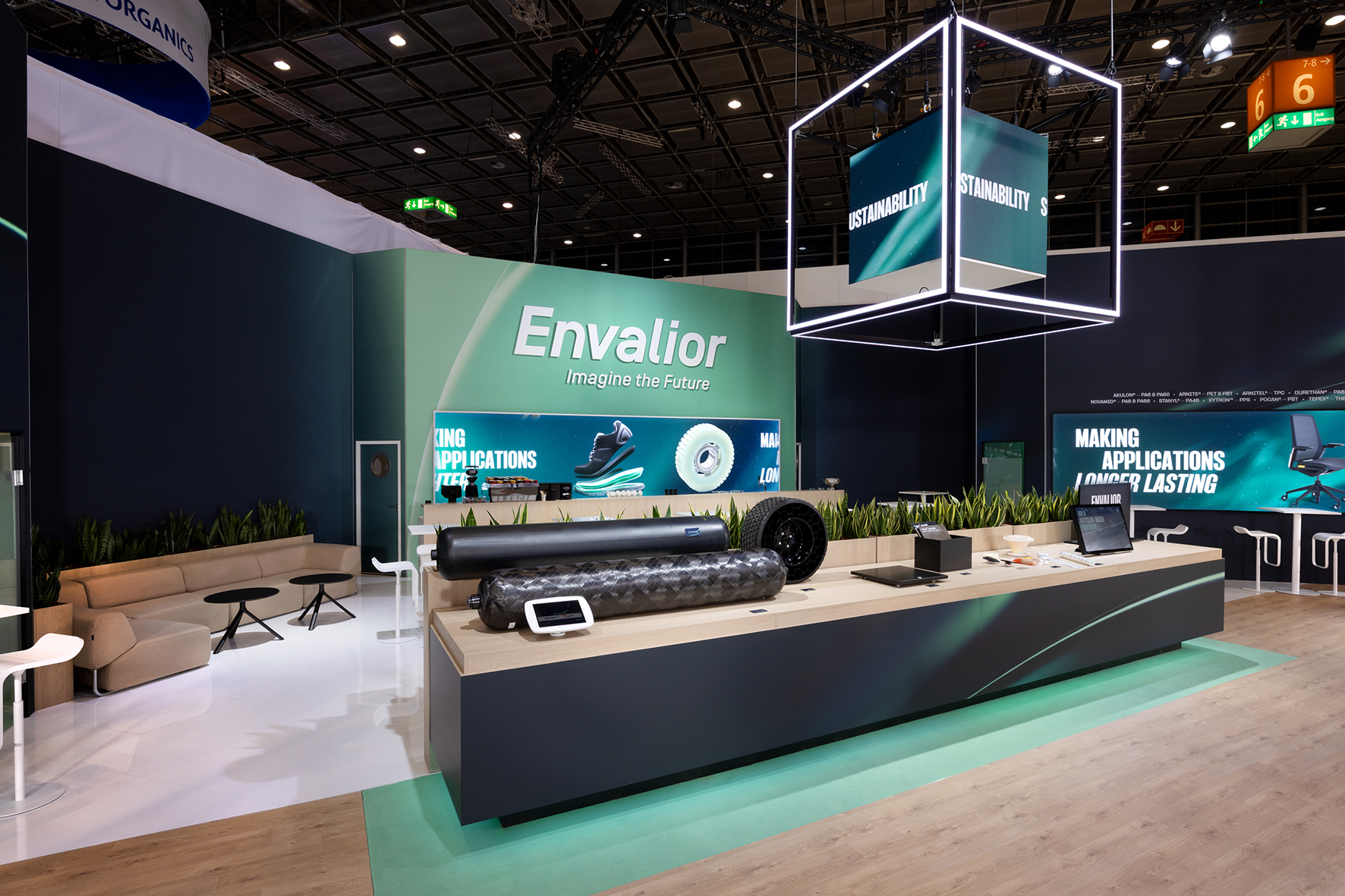 Een opvallende en levendige stand, boordevol innovaties, die de energie en merkidentiteit van Envalior perfect weerspiegelt. Grote LED-verlichte kubussen met geïntegreerde projecties en imposante LED-wanden lieten het diverse productaanbod van het bedrijf schitterend zien en maakten een onvergetelijke indruk.